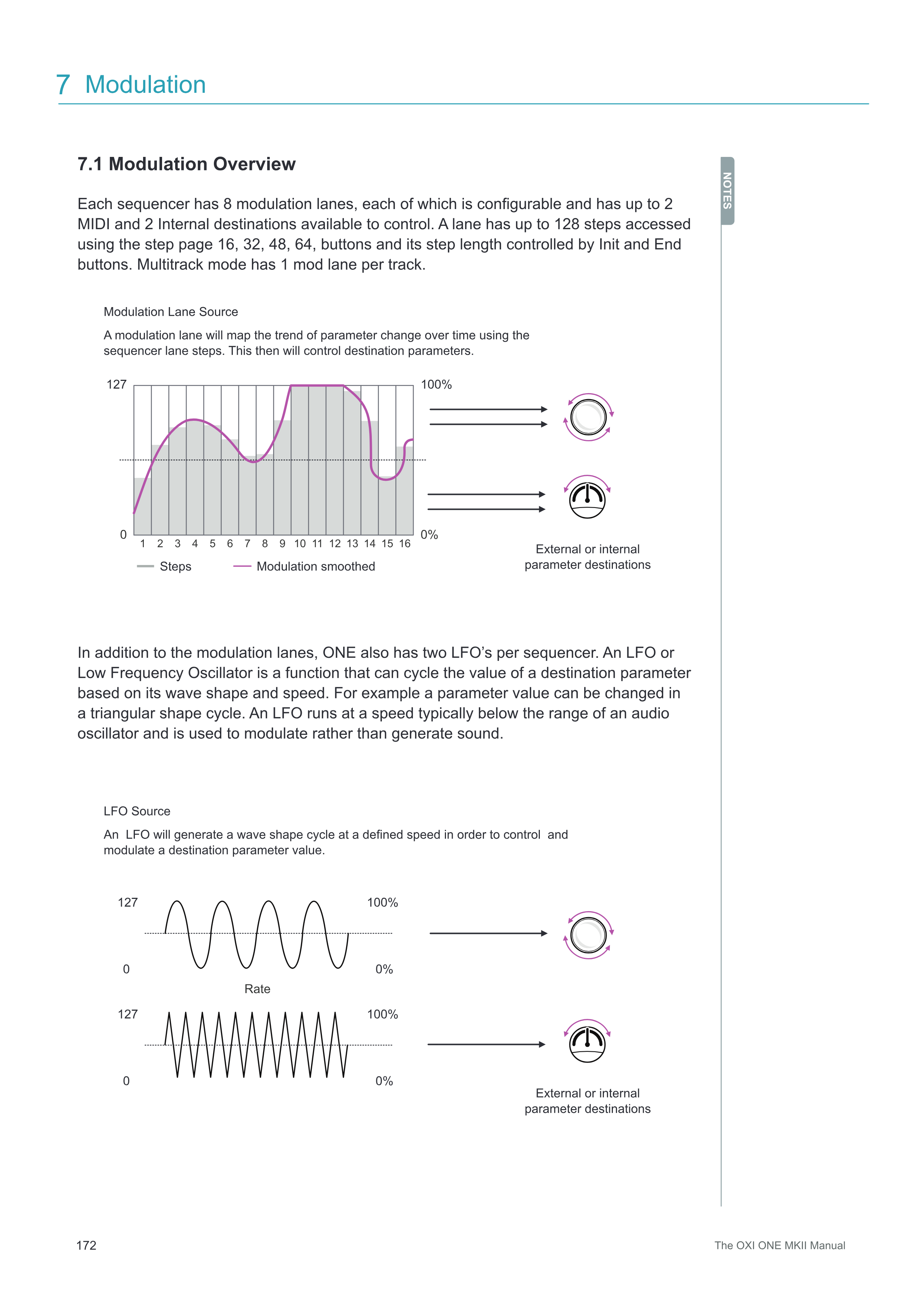 Modulation Lane Source LFO Source Steps Modulation smoothed Rate 0 1 9 5 13 3 11 7 15 2 10 6 14 4 12 8 16 0% 127 127 127 0 0 100% 100% 100% 0% 0% External or internal parameter destinations External or internal parameter destinations