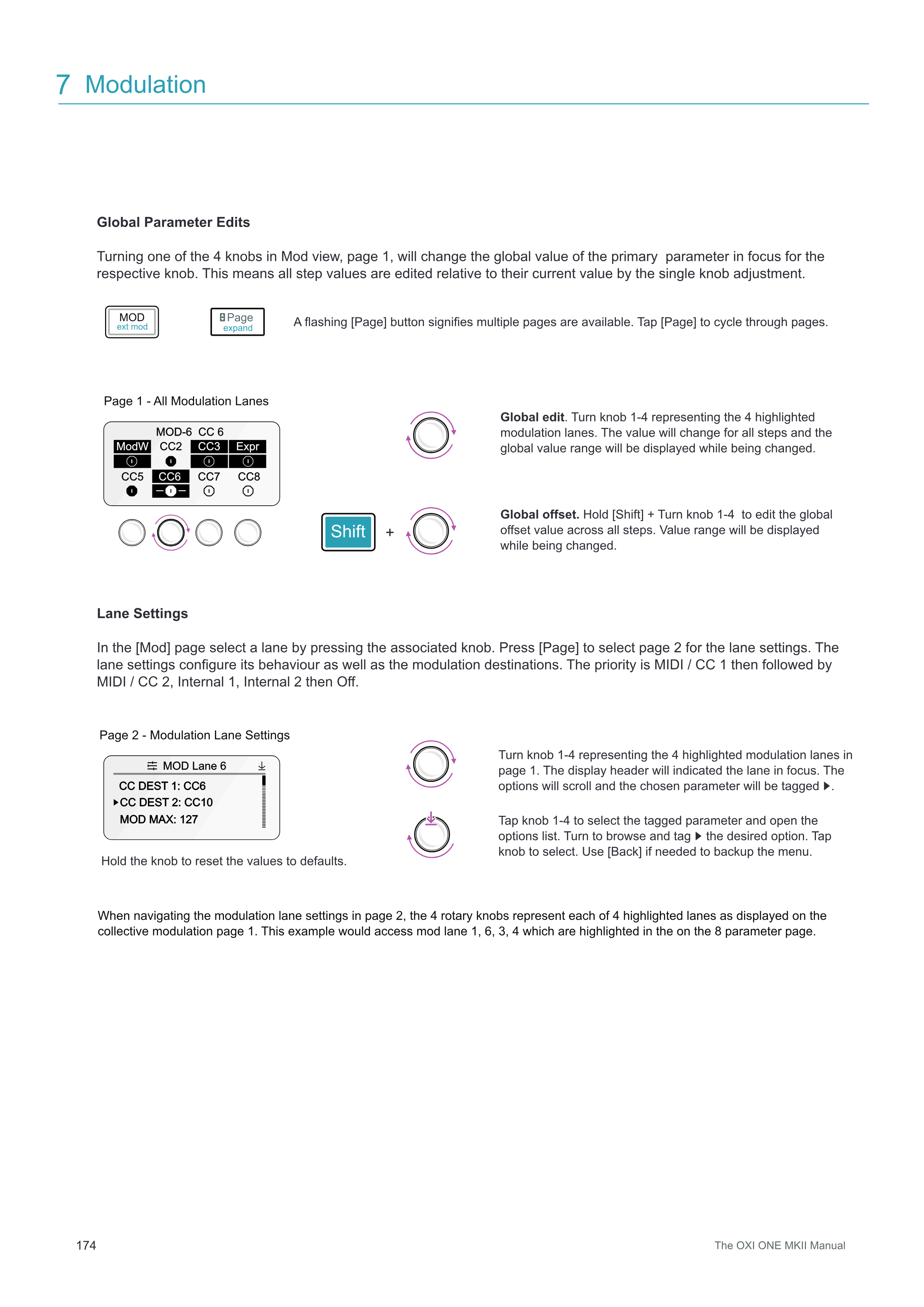 [Mod]ページで関連するノブを押してレーンを選択します。[Page]を押してレーン設定のページ2を選択します。レーン設定では、その動作とmodulationの送信先を設定します。優先順位はMIDI / CC 1、次にMIDI / CC 2、Internal 1、Internal 2、そしてOffです。