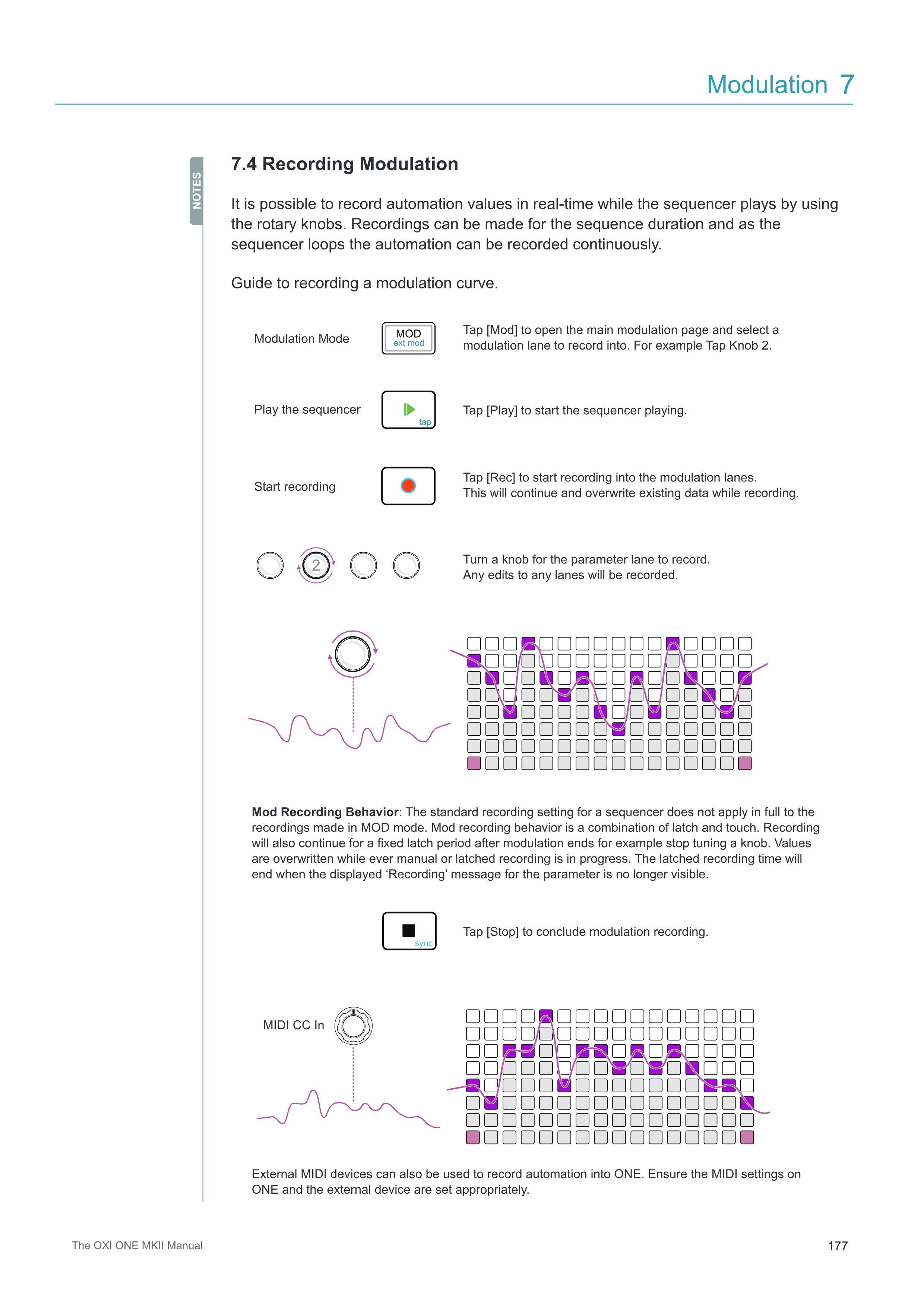 Mod Recording Behavior: Sequencerの標準的な記録設定は、MODモードで行われる記録には完全には適用されません。Modの記録動作はlatchとtouchの組み合わせです。記録は、modulationが終了した後も一定のlatch期間継続します。例えばノブの調整を停止した後も継続します。手動またはlatchされた記録が進行中である限り、値は上書きされます。Latchされた記録時間は、パラメータの「Recording」メッセージの表示が見えなくなると終了します。