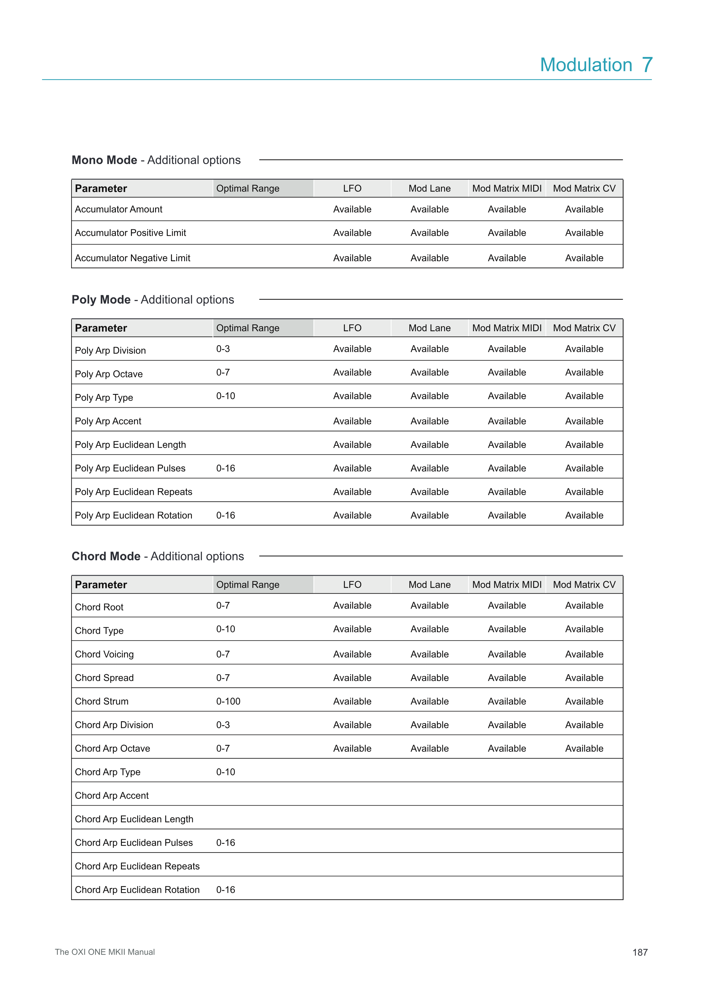 パラメータ 最適範囲 LFO Mod Lane Mod Matrix MIDI Mod Matrix CV Poly Arp Division 0-3 Available Available Available Available Poly Arp Octave 0-7 Available Available Available Available Poly Arp Type 0-10 Available Available Available Available Poly Arp Accent Available Available Available Available Poly Arp Euclidean Length Available Available Available Available Poly Arp Euclidean Pulses 0-16 Available Available Available Available Poly Arp Euclidean Repeats Available Available Available Available Poly Arp Euclidean Rotation 0-16 Available Available Available Available