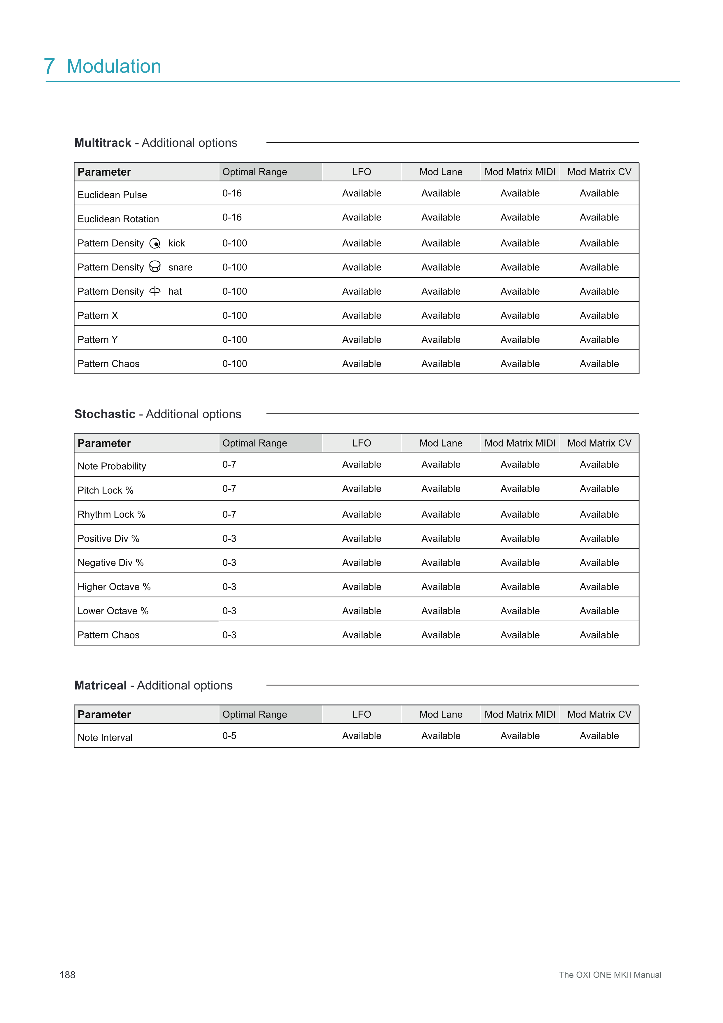 Parameter Optimal Range LFO Mod Lane Mod Matrix MIDI Mod Matrix CV Note Probability 0-7 Available Available Available Available Pitch Lock % 0-7 Available Available Available Available Rhythm Lock % 0-7 Available Available Available Available Positive Div % 0-3 Available Available Available Available Negative Div % 0-3 Available Available Available Available Higher Octave % 0-3 Available Available Available Available Lower Octave % 0-3 Available Available Available Available Pattern Chaos 0-3 Available Available Available Available