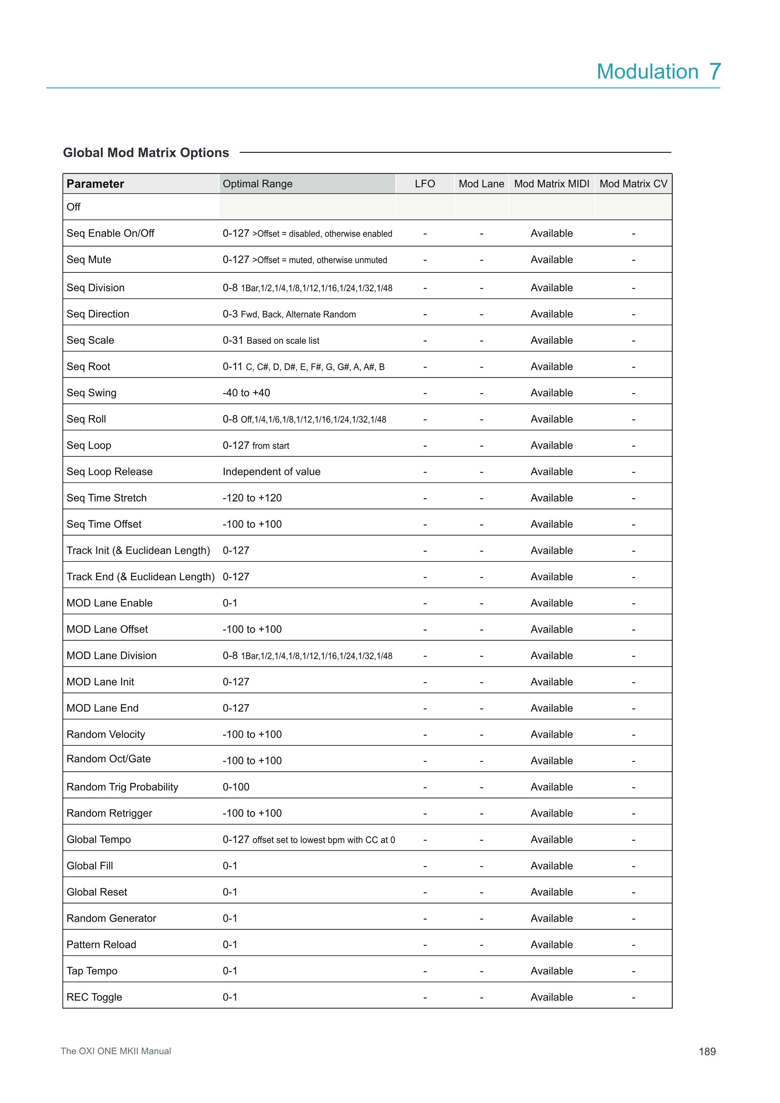 Parameter Optimal Range LFO Mod Lane Mod Matrix MIDI Mod Matrix CV