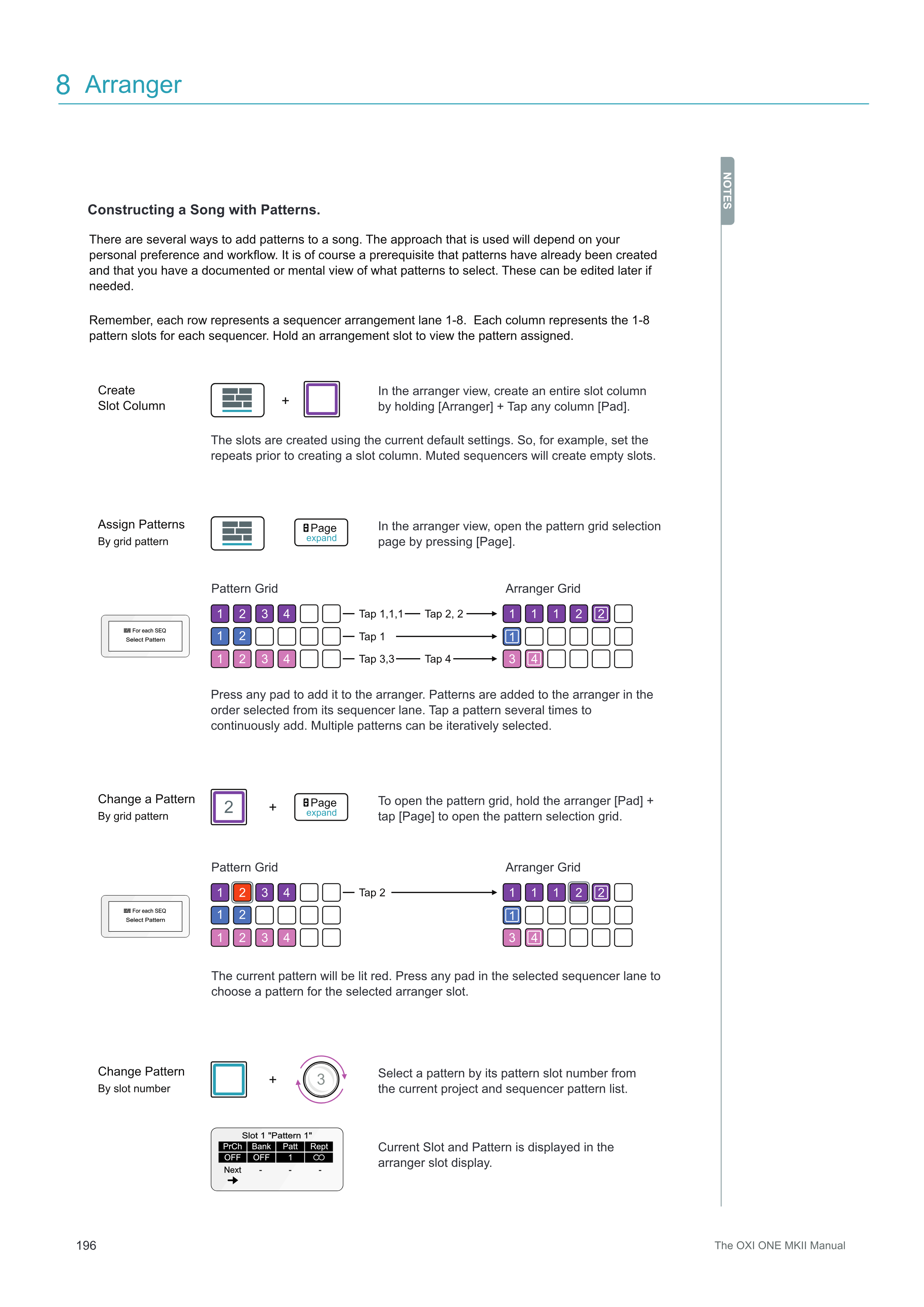 各行はsequencerアレンジメントレーン1-8を表します。各列は各sequencerの1-8パターンスロットを表します。アレンジメントスロットをホールドすると、割り当てられたパターンが表示されます。