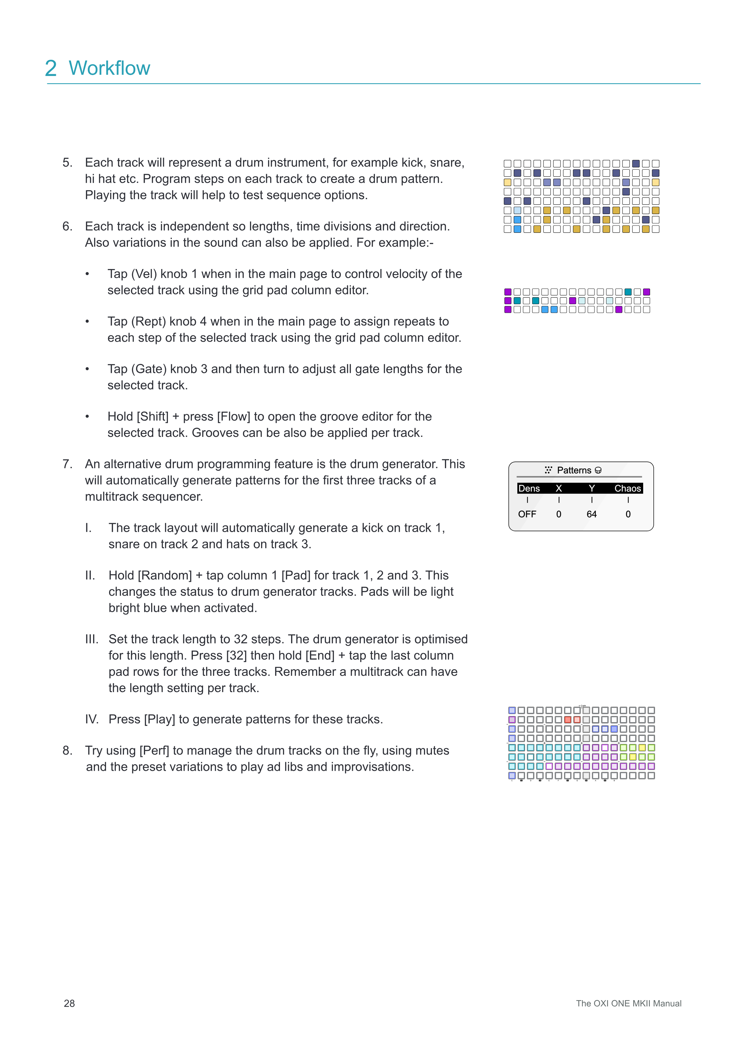 III. トラック長を32ステップに設定します。ドラムジェネレーターはこの長さに最適化されています。[32]を押してから、[End]を押しながら3つのトラックの最後のカラムパッド行をタップします。マルチトラックではトラックごとに長さを設定できることを覚えておいてください。