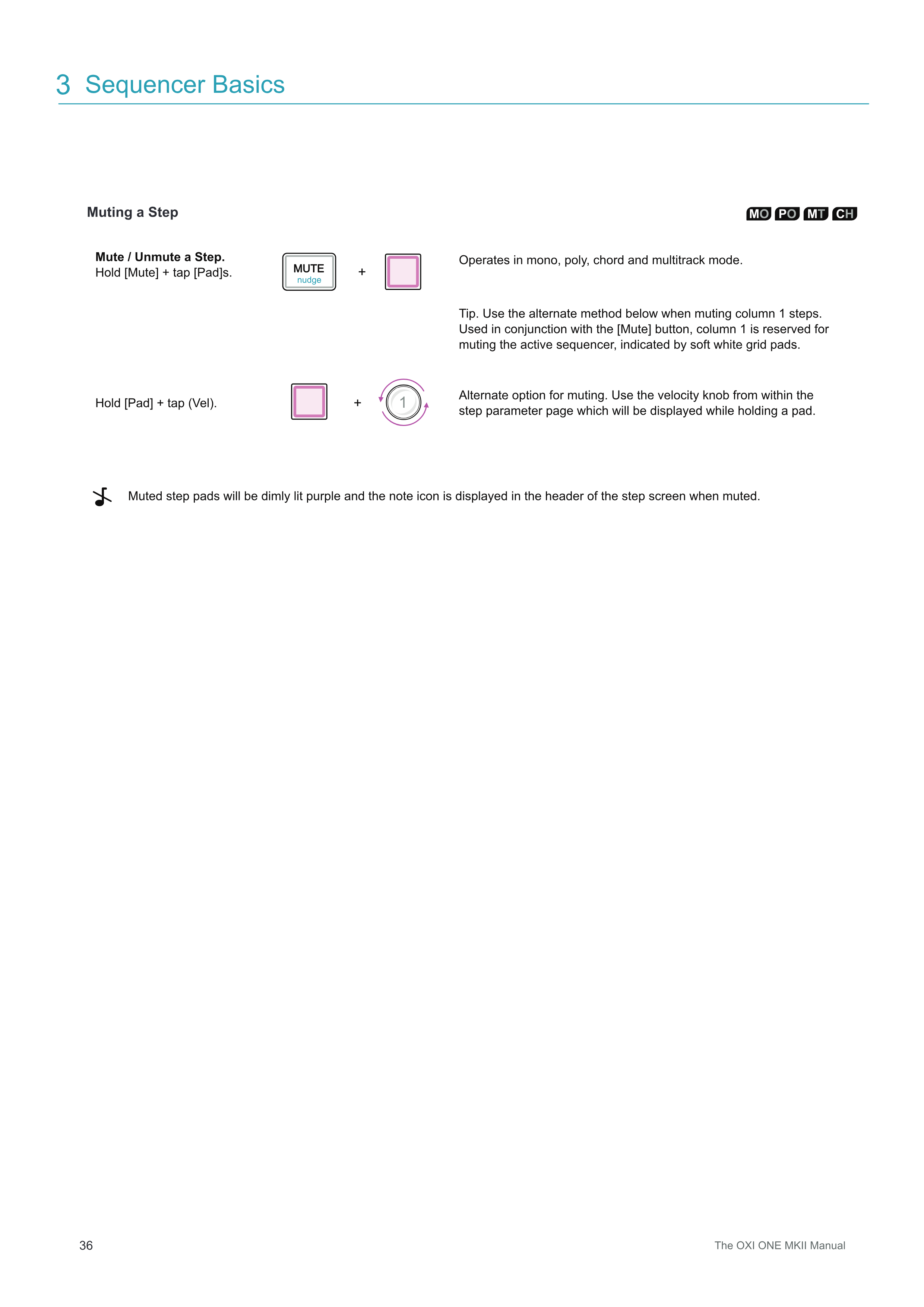 ミュートされたステップパッドは薄紫色に点灯し、ミュート時にはステップ画面のヘッダーにノートアイコンが表示されます。