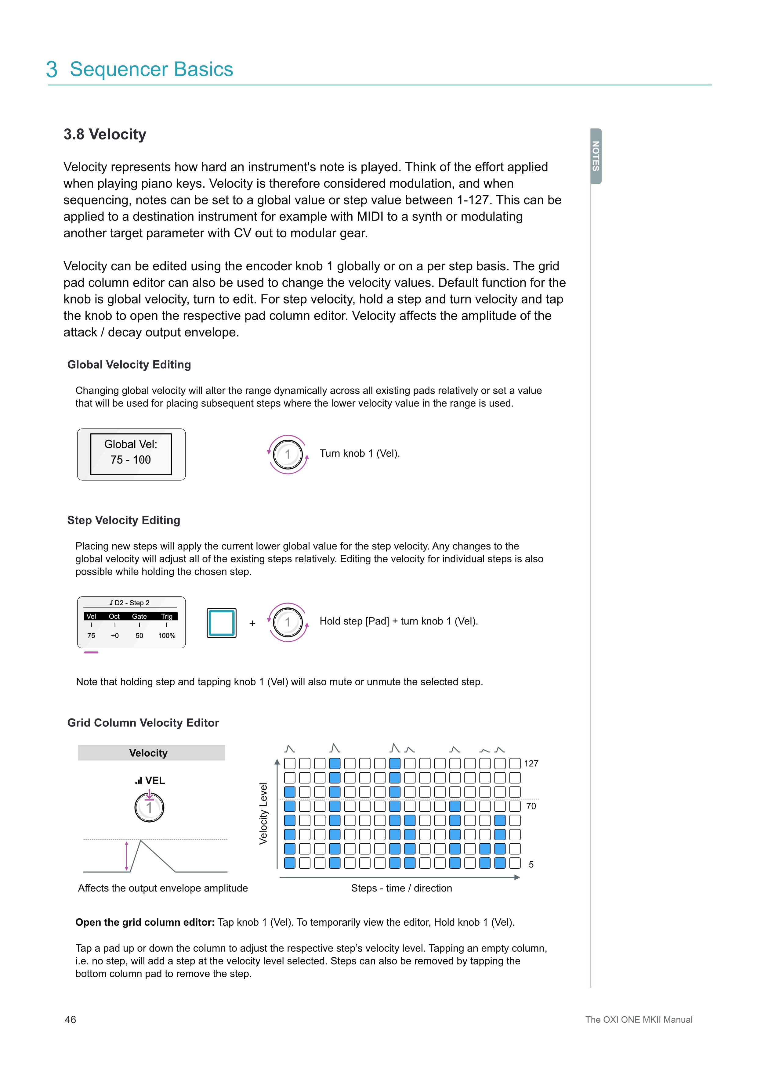 Velocityは、エンコーダーノブ1を使用してグローバルに、またはステップごとに編集できます。グリッドパッドカラムエディターを使用してVelocity値を変更することもできます。ノブのデフォルト機能はグローバルVelocityで、回して編集します。ステップVelocityの場合は、ステップをホールドしてVelocityを回し、ノブをタップして対応するパッドカラムエディターを開きます。Velocityは、アタック/ディケイ出力エンベロープの振幅に影響します。