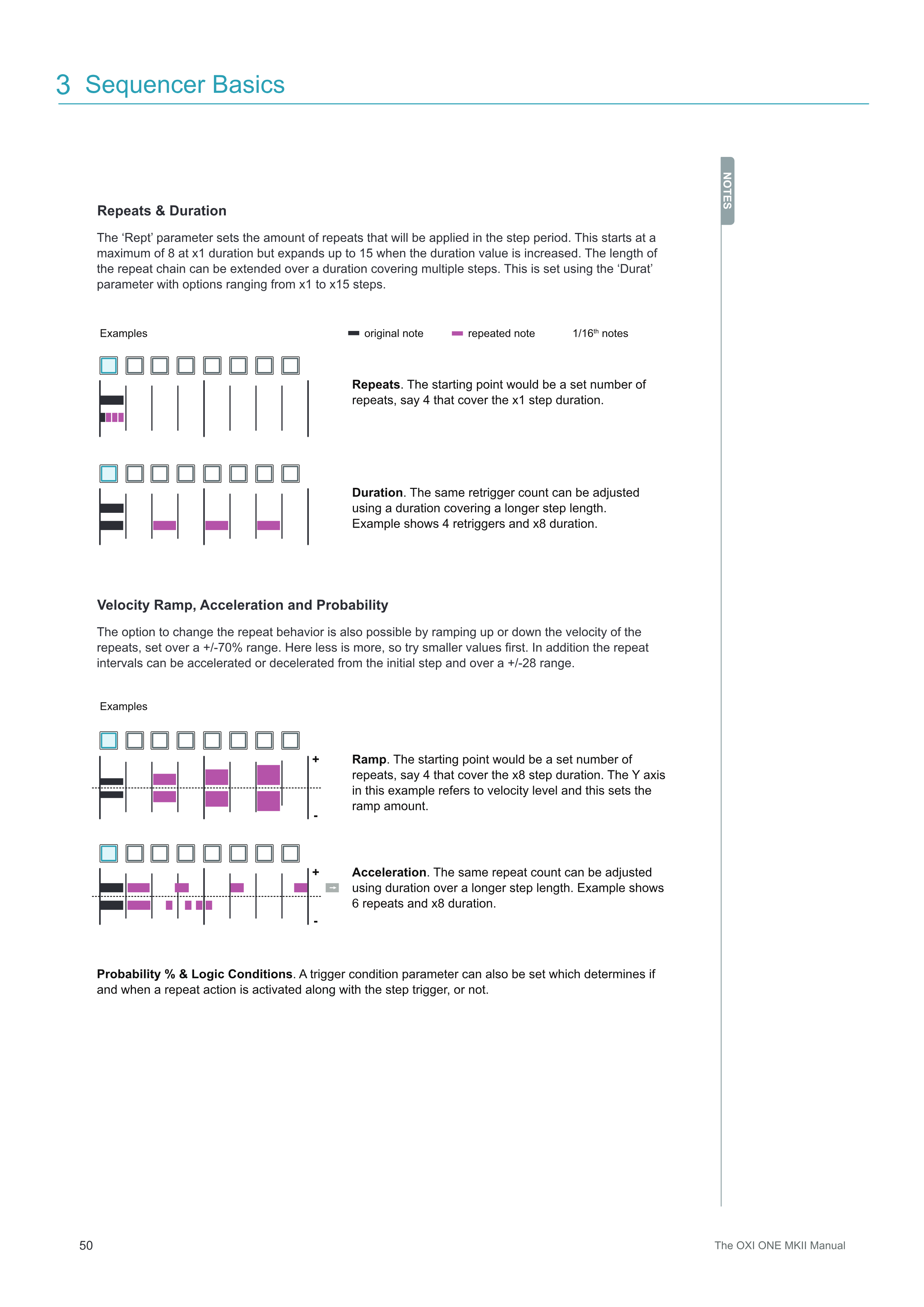 'Rept'パラメーターは、ステップ期間中に適用されるリピート数を設定します。これはx1 durationで最大8から開始しますが、duration値を増やすと最大15まで拡大します。リピートチェーンの長さは、複数のステップをカバーするdurationで拡張できます。これは'Durat'パラメーターを使用して設定され、x1からx15ステップの範囲のオプションがあります。