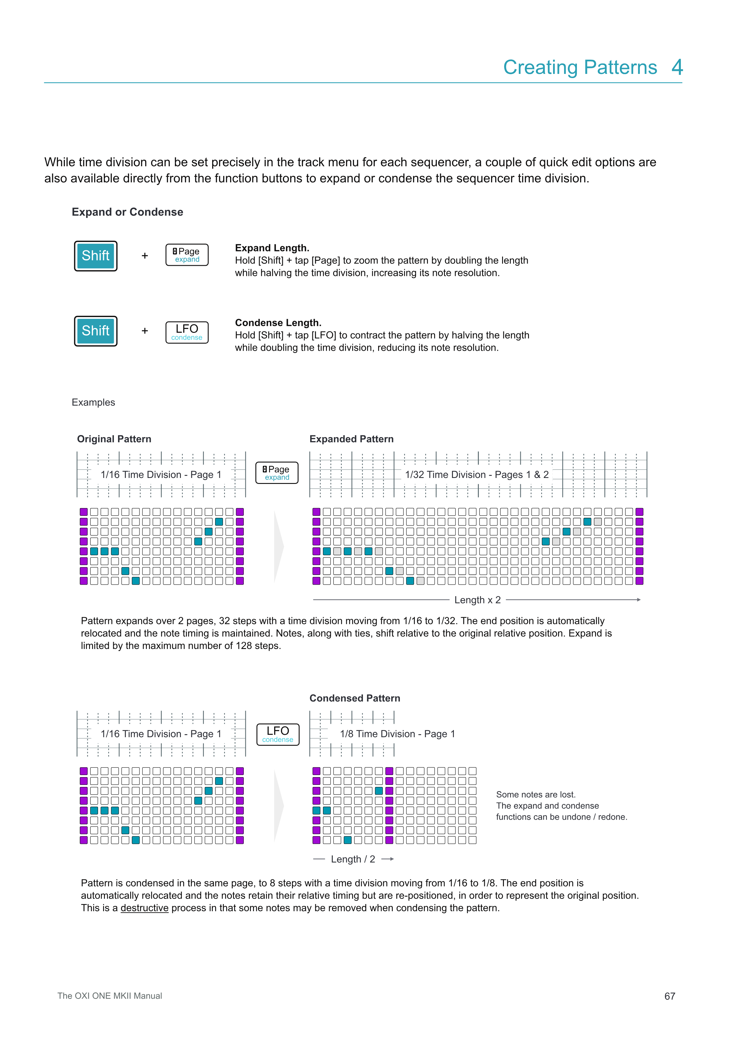 [Shift]を押しながら[LFO]をタップすると、時間分解能を2倍にしながら長さを半分にしてpatternを縮小し、ノート分解能を下げます。
