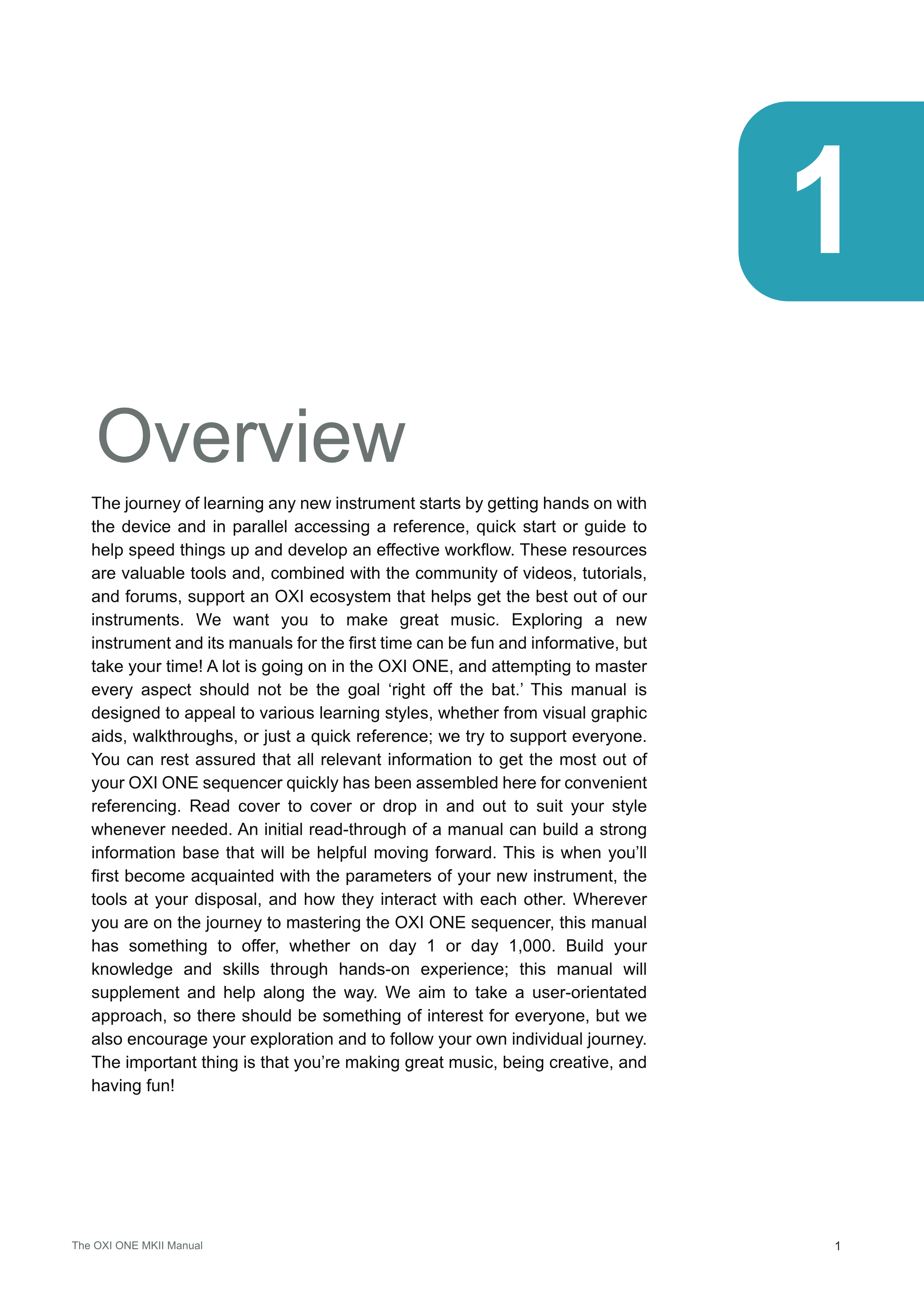 新しい楽器の学習の旅は、実際に手に取って触れることから始まり、それと並行してリファレンス、クイックスタート、またはガイドにアクセスして、習得を加速し、効果的なワークフローを構築していきます。これらのリソースは貴重なツールであり、コミュニティによる動画、チュートリアル、フォーラムと組み合わせることで、楽器を最大限に活用するためのOXIエコシステムをサポートします。私たちは、あなたに素晴らしい音楽を作ってほしいと願っています。新しい楽器とそのマニュアルを初めて探索することは、楽しく有益な体験となりますが、焦らずゆっくり進めてください!OXI ONEには多くの機能が詰まっており、すべての側面を「最初から」マスターしようとすることを目標にすべきではありません。このマニュアルは、視覚的なグラフィック補助、ウォークスルー、あるいは単なるクイックリファレンスなど、さまざまな学習スタイルに対応できるように設計されており、すべての人をサポートすることを目指しています。OXI ONE sequencerを最大限に活用するために必要なすべての関連情報が、便利に参照できるようにここにまとめられていますので、ご安心ください。表紙から最後まで通して読むことも、必要に応じて自分のスタイルに合わせて出入りすることもできます。マニュアルを最初に一読することで、今後役立つ強固な情報基盤を構築できます。これは、新しい楽器のパラメータ、使用可能なツール、そしてそれらがどのように相互作用するかを初めて知る機会となります。OXI ONE sequencerをマスターする旅のどの段階にいても、このマニュアルには1日目でも1,000日目でも、何かしら提供できるものがあります。実践的な経験を通じて知識とスキルを構築してください。このマニュアルは、その道のりを補完し、サポートします。私たちはユーザー志向のアプローチを目指しているため、すべての人にとって興味深い何かがあるはずですが、同時にあなた自身の探索と個別の旅路を辿ることも奨励しています。重要なのは、素晴らしい音楽を作り、創造的であり、そして楽しむことです!