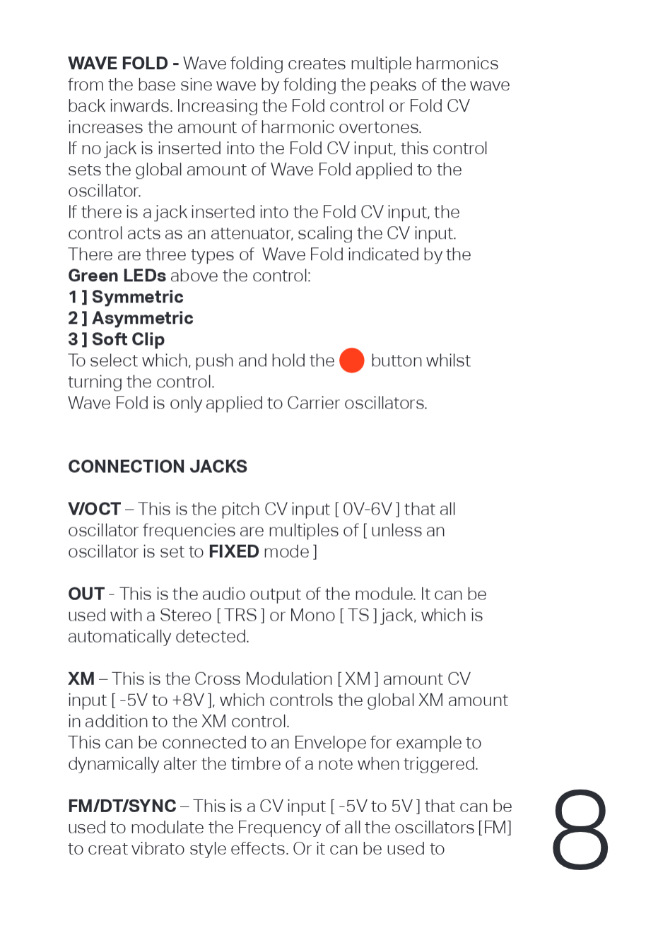 Wave Foldには3種類あり、コントロール上部のGreen LEDで示されます: 1 ] Symmetric 2 ] Asymmetric 3 ] Soft Clip