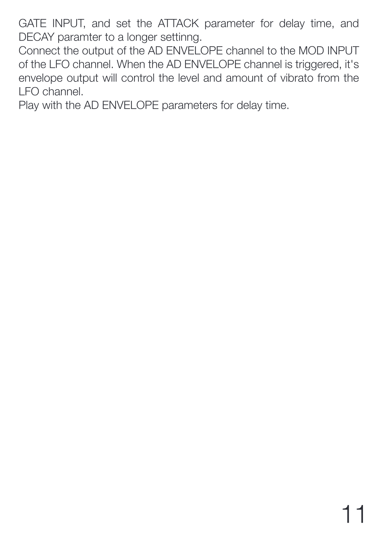 GATE INPUTに接続し、ATTACKパラメーターをディレイタイムとして設定し、DECAYパラメーターを長めの値に設定します。