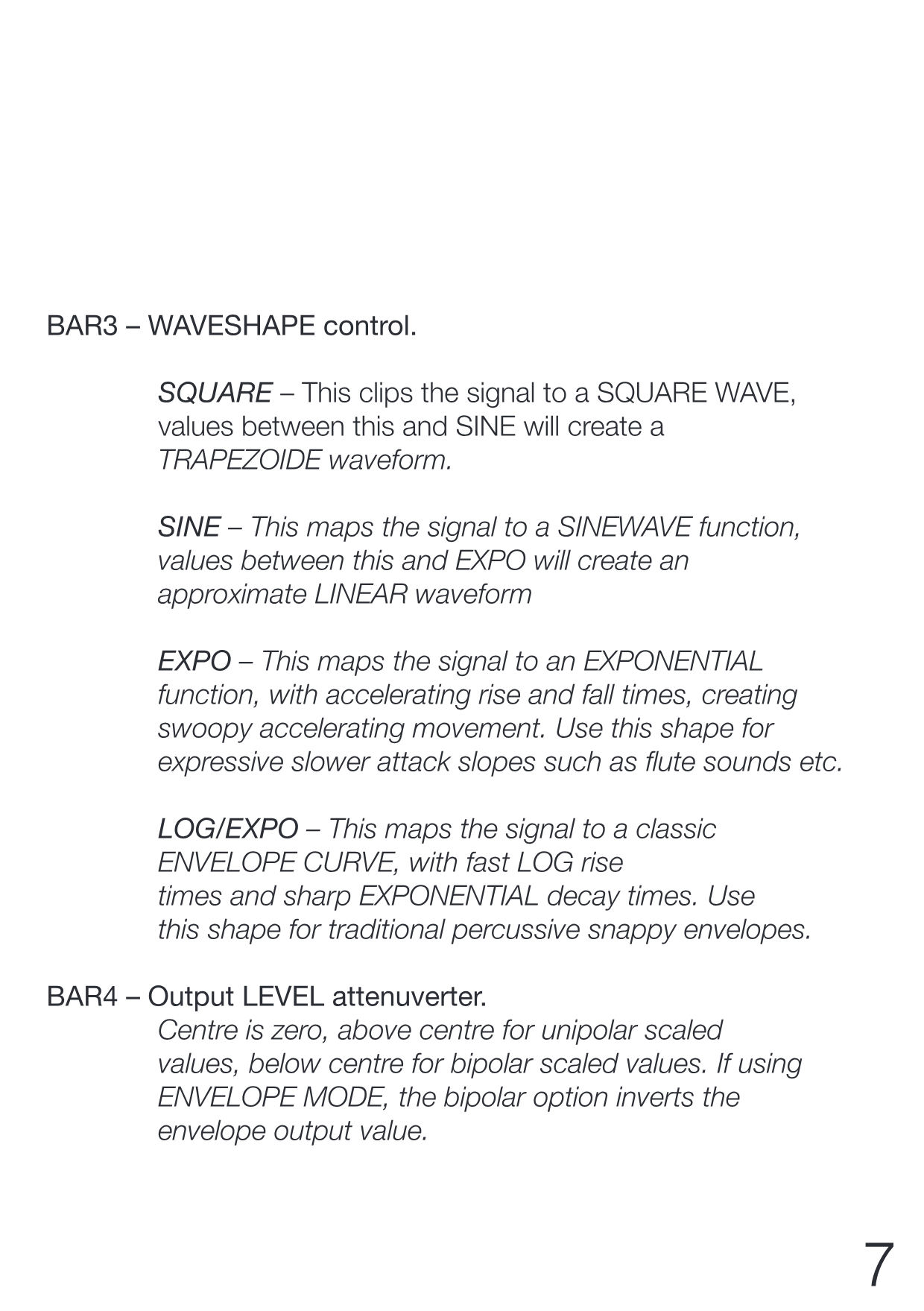 EXPO – 信号をEXPONENTIAL関数にマッピングします。立ち上がりと立ち下がり時間が加速し、スムーズな加速運動を作り出します。フルートなどの表情豊かなスローアタックスロープにこの波形を使用してください。