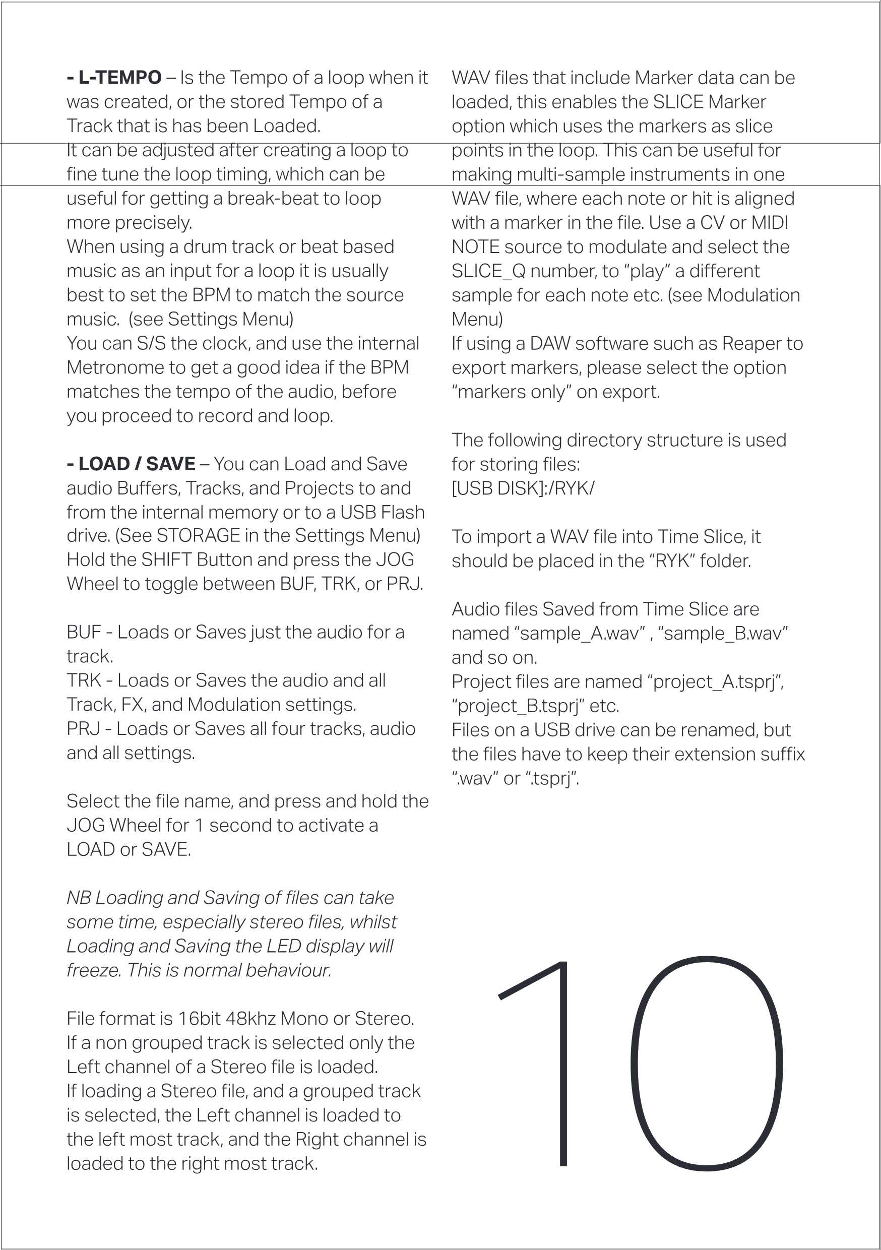 Markerデータを含むWAVファイルをロードできます。これによりSLICE Markerオプションが有効になり、MarkerがLoop内のSliceポイントとして使用されます。これは1つのWAVファイル内にマルチサンプル楽器を作成する場合に便利で、各ノートやヒットがファイル内のMarkerに合わせられます。CVまたはMIDI NOTEソースを使用してSLICE_Q番号をモジュレーションおよび選択し、各ノートごとに異なるサンプルを「再生」します。(Modulation Menuを参照)