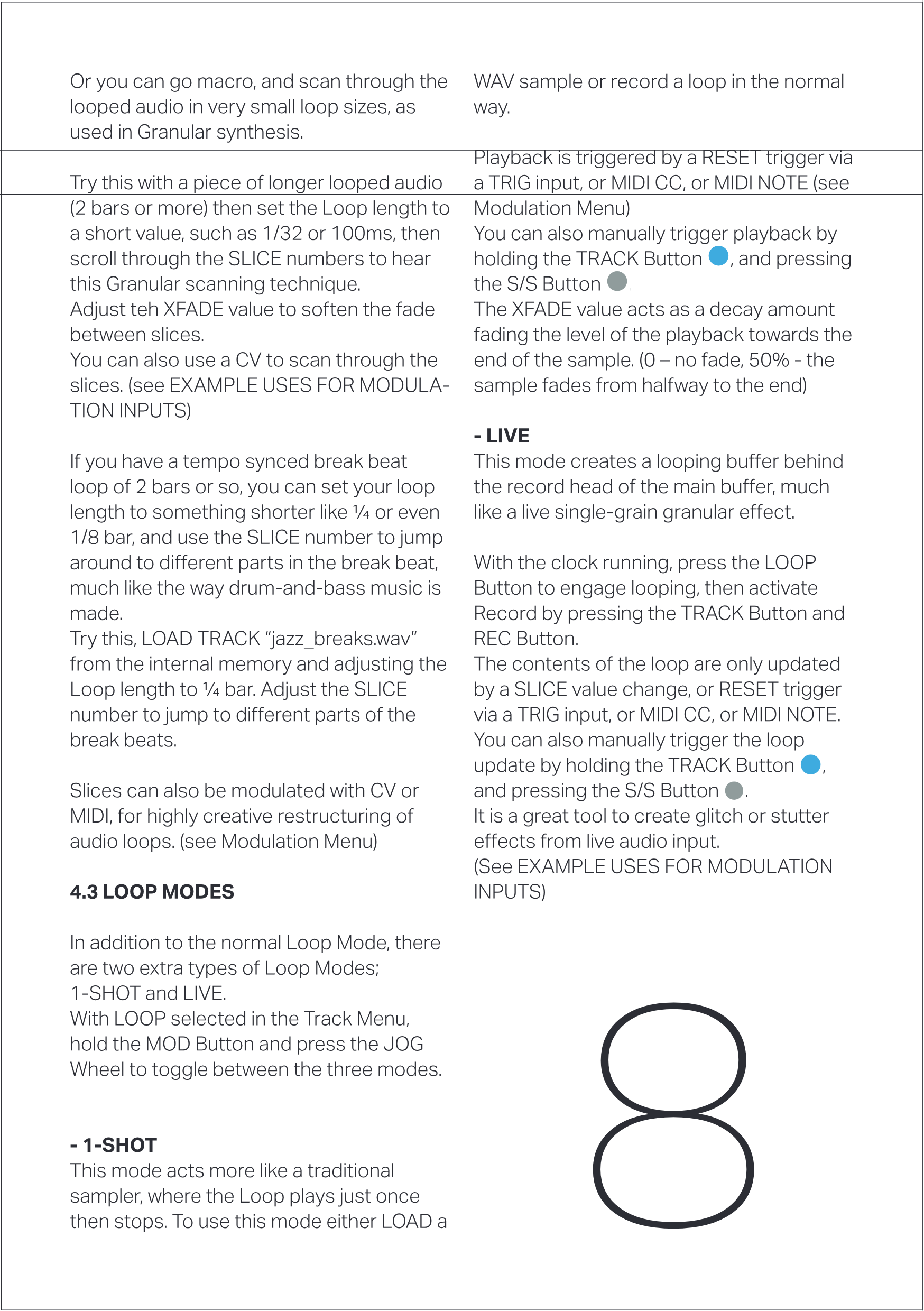 Loopの内容は、SLICE値の変更、またはTRIG入力、MIDI CC、MIDI NOTEを介したRESETトリガーによってのみ更新されます。