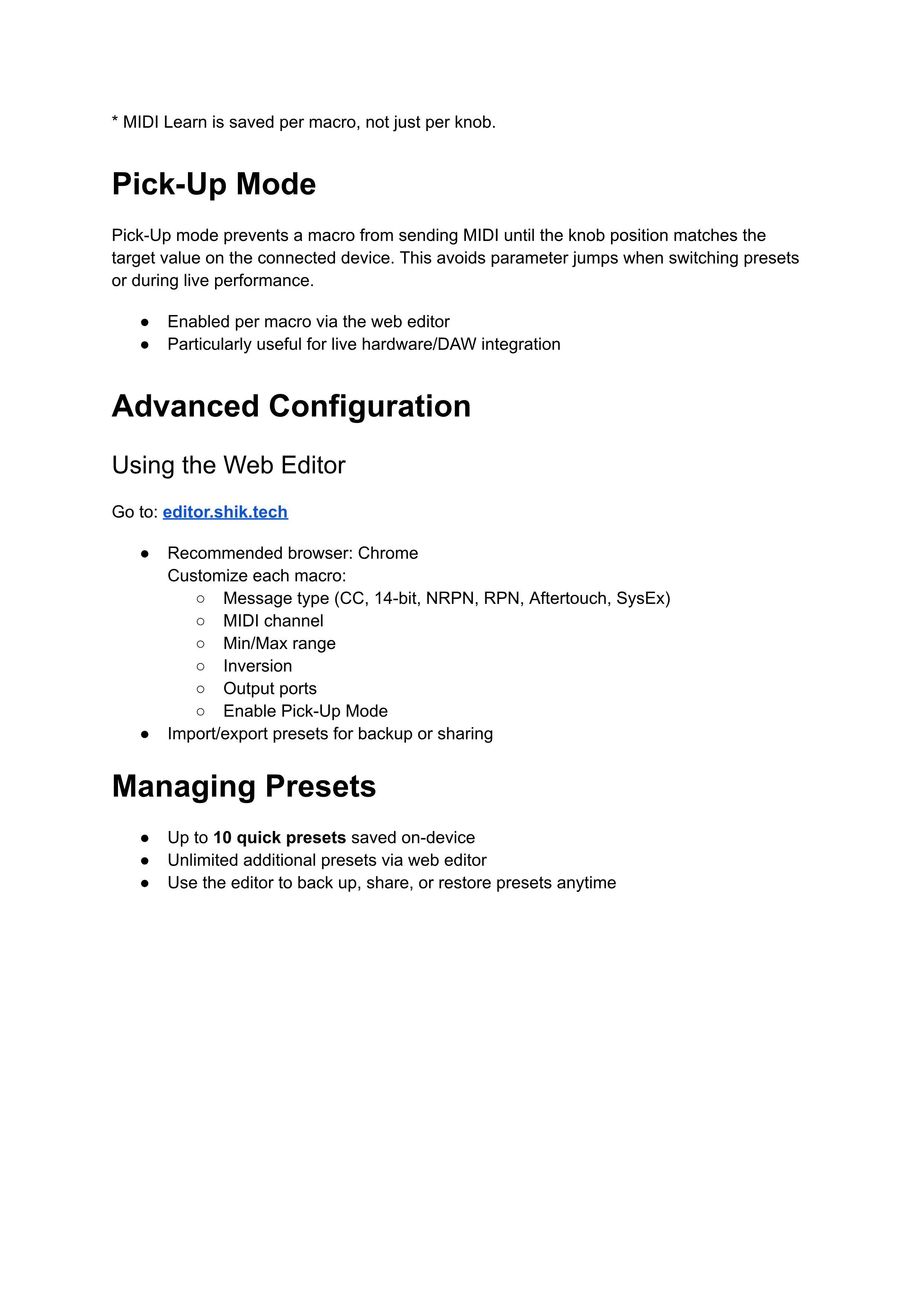 ● 最大10個のクイックプリセットをデバイスに保存可能 ● Webエディタ経由で無制限の追加プリセット ● いつでもエディタを使用してプリセットのバックアップ、共有、復元が可能