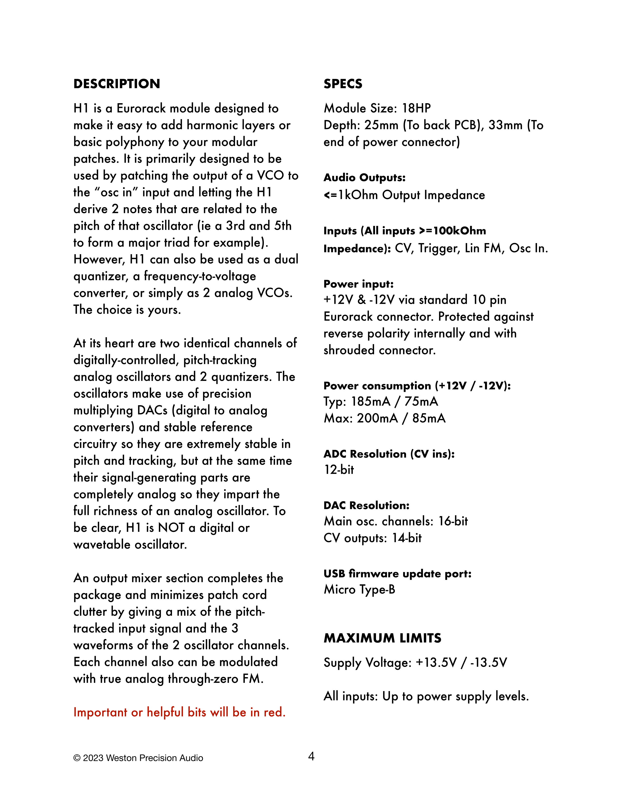 電源入力: +12V & -12V、標準10ピンEurorackコネクタ経由。内部および被覆コネクタで逆極性保護。