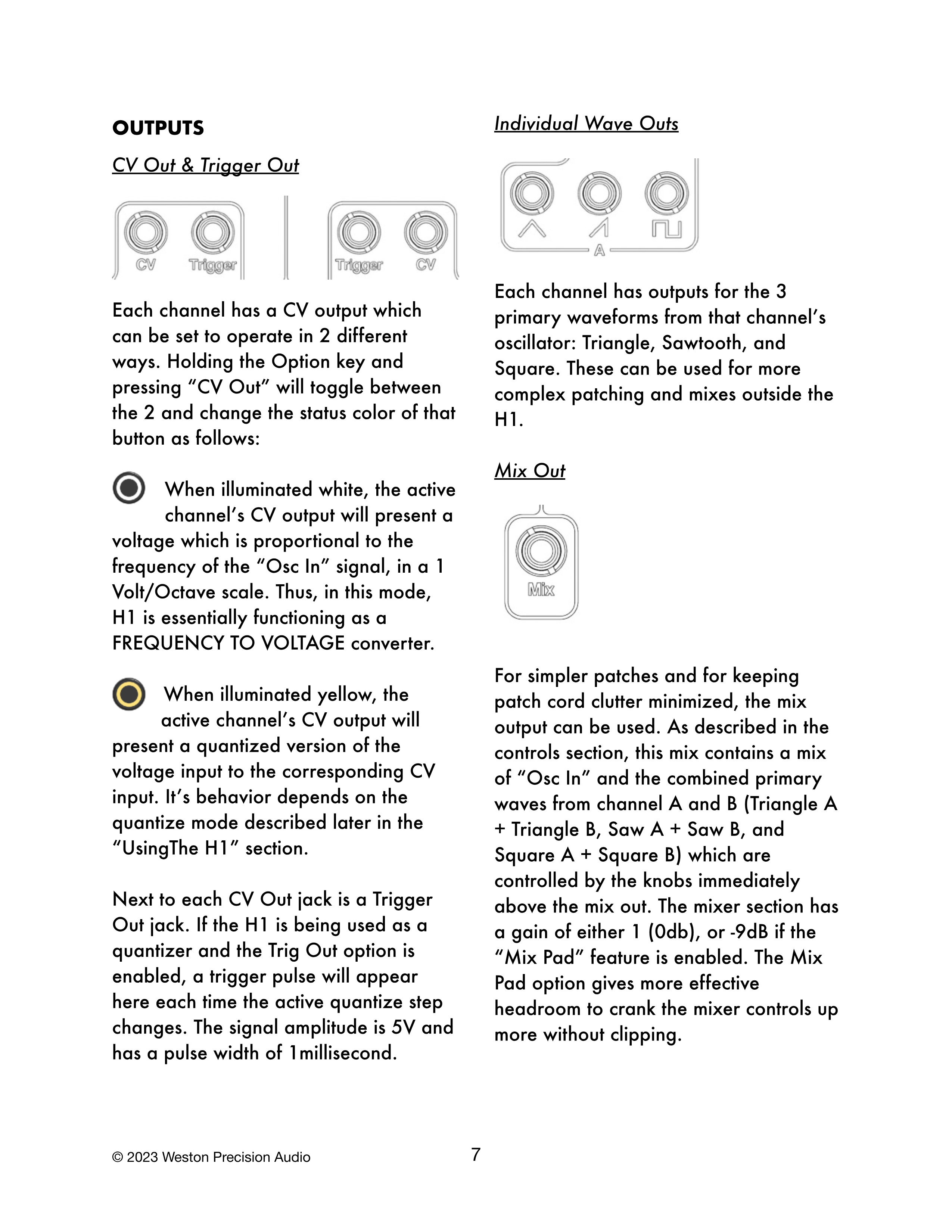 各チャンネルには、そのチャンネルのオシレーターから生成される3つの主要な波形(Triangle、Sawtooth、Square)の出力があります。これらは、H1の外部でより複雑なパッチングやミックスを行うために使用できます。