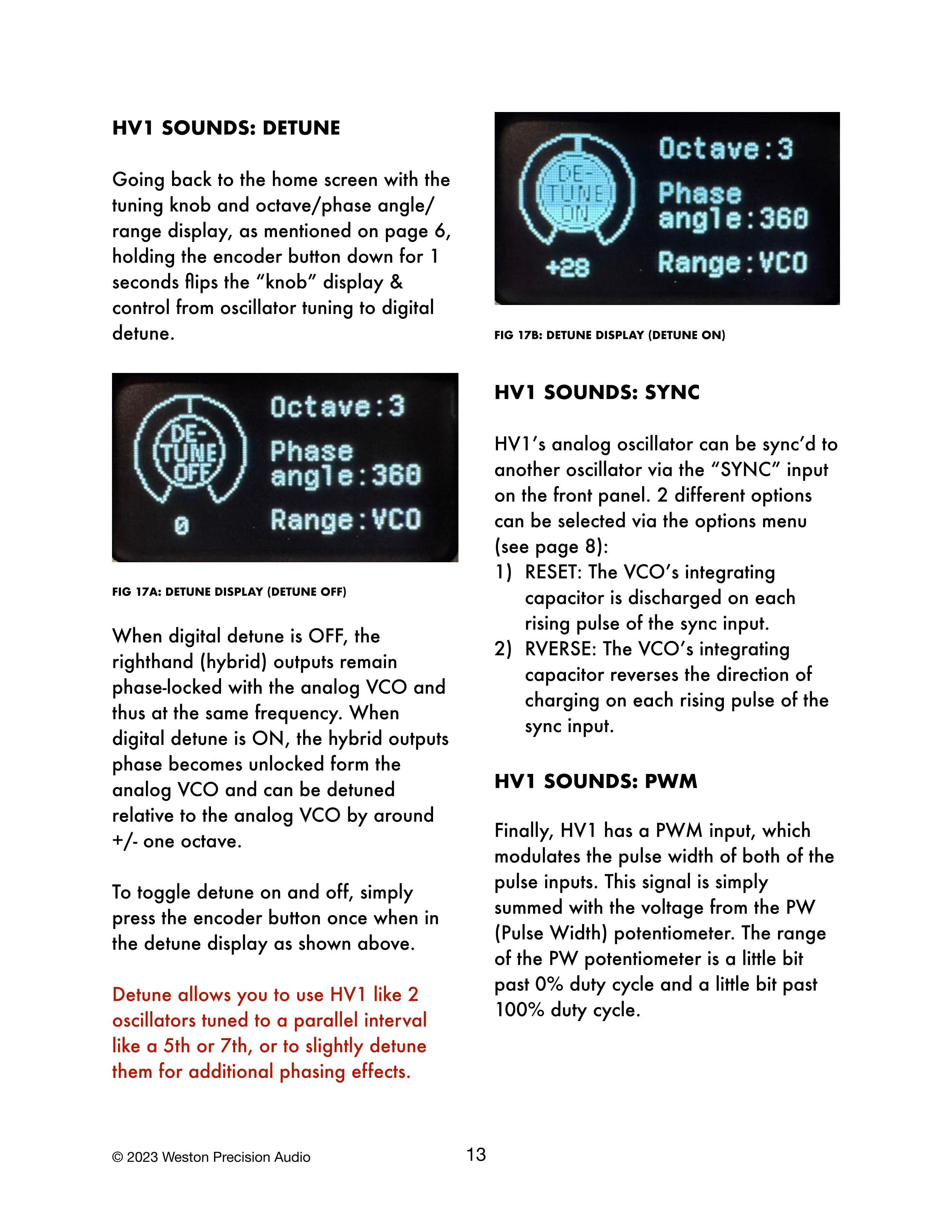 デチューンを使用すると、HV1を5度や7度のような平行インターバルにチューニングされた2つのオシレーターのように使用したり、わずかにデチューンして追加のフェージング効果を得ることができます。