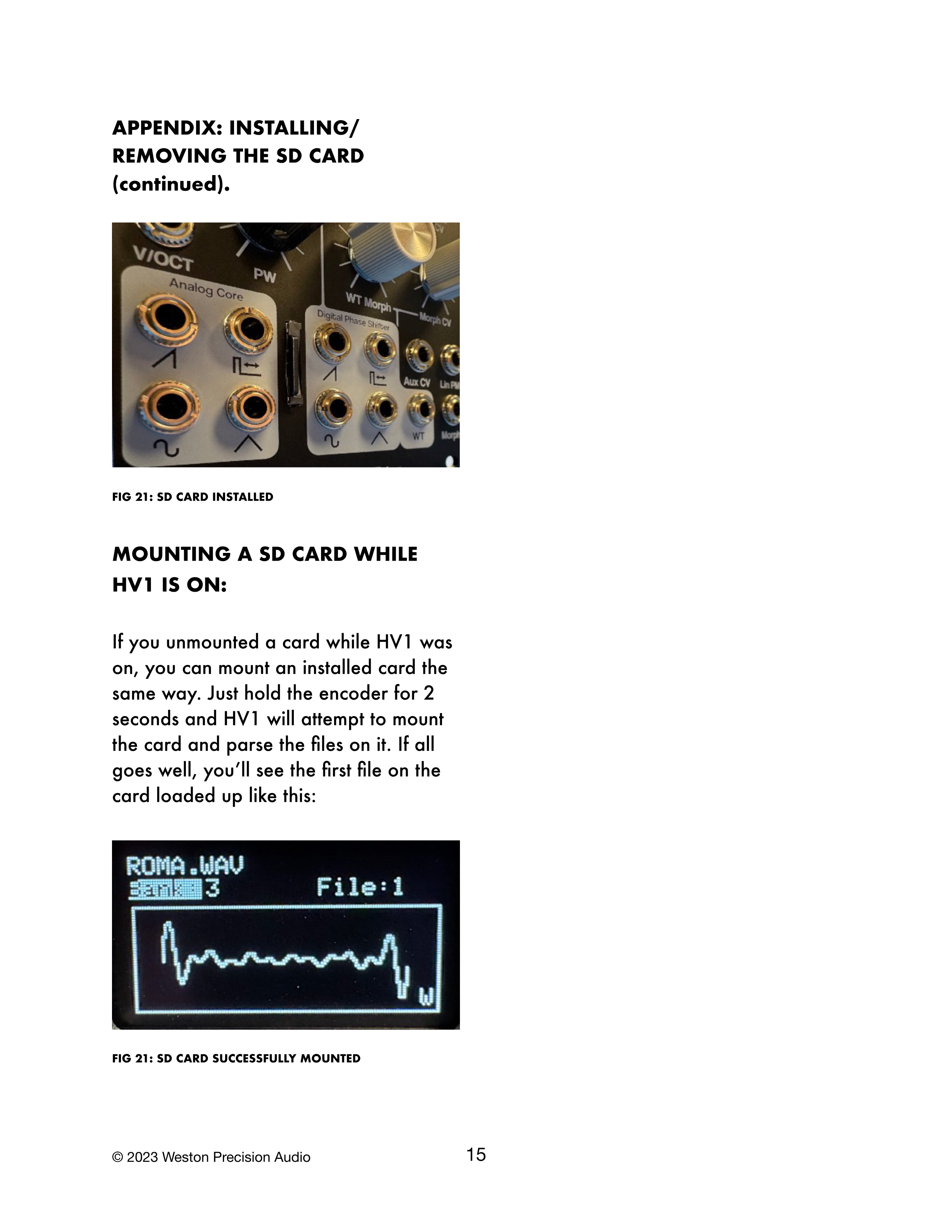 HV1の電源が入っている状態でカードをアンマウントした場合、同じ方法で取り付けられたカードをマウントすることができます。エンコーダーを2秒間長押しするだけで、HV1はカードのマウントを試み、カード内のファイルを解析します。すべてが正常に完了すると、次のようにカード内の最初のファイルが読み込まれた状態が表示されます: