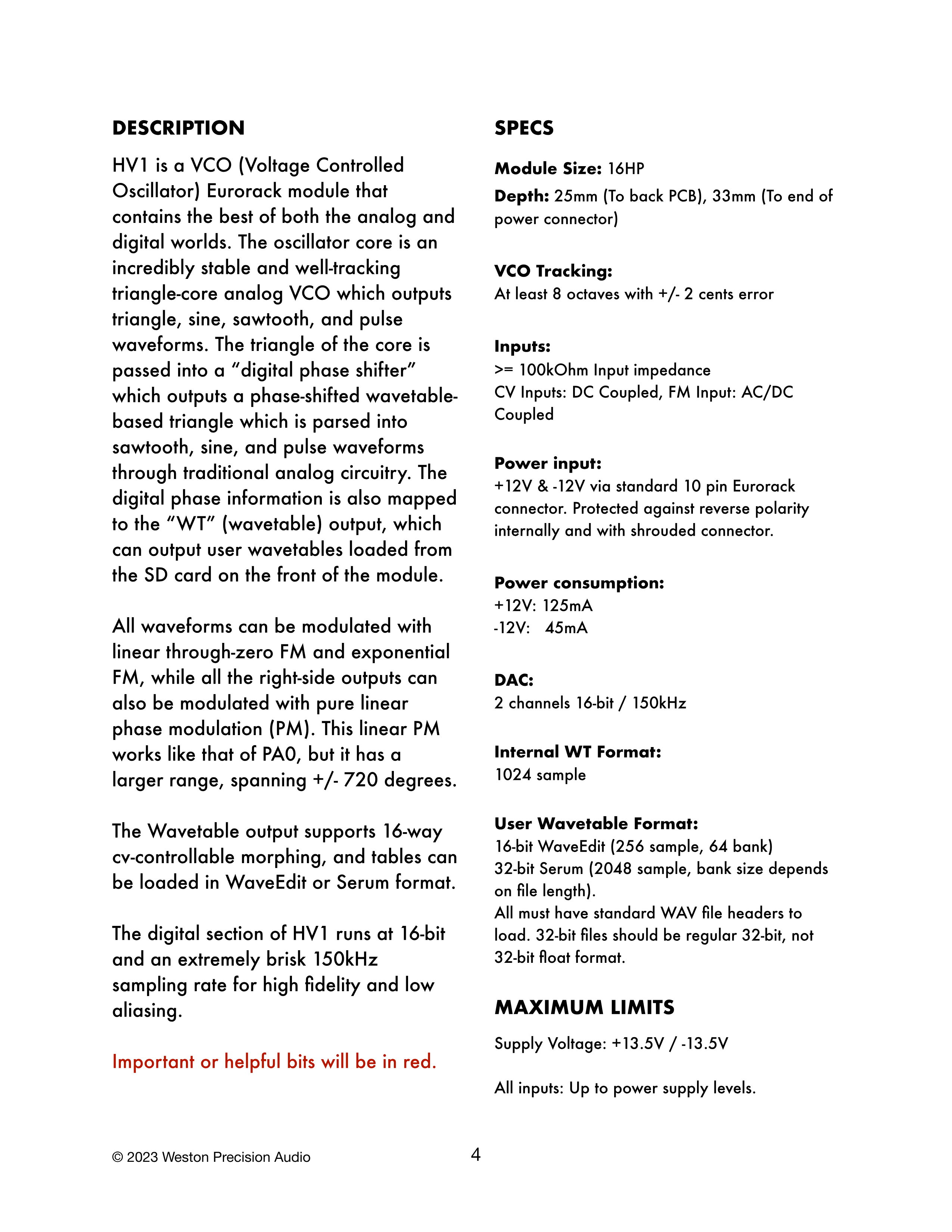 Wavetable出力は16ウェイCV制御可能なモーフィングをサポートし、WaveEditまたはSerum形式でテーブルを読み込めます。HV1のデジタルセクションは16-bit、極めて高速な150kHzサンプリングレートで動作し、高い忠実度と低いエイリアシングを実現します。