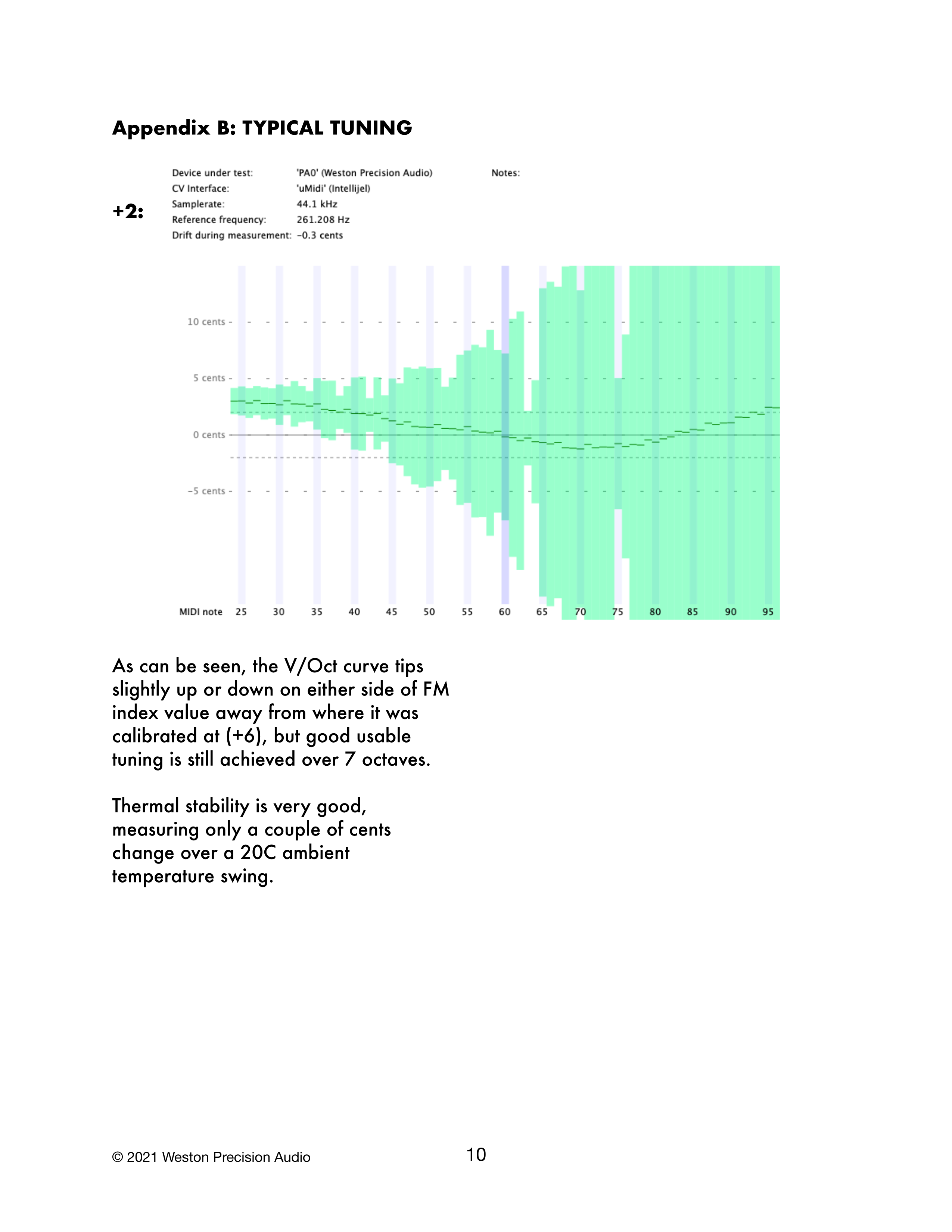 ご覧のように、V/Octカーブはキャリブレーションされた位置(+6)から離れたFM indexの値の両側でわずかに上下に傾きますが、7オクターブにわたって良好で使用可能なチューニングが得られます。