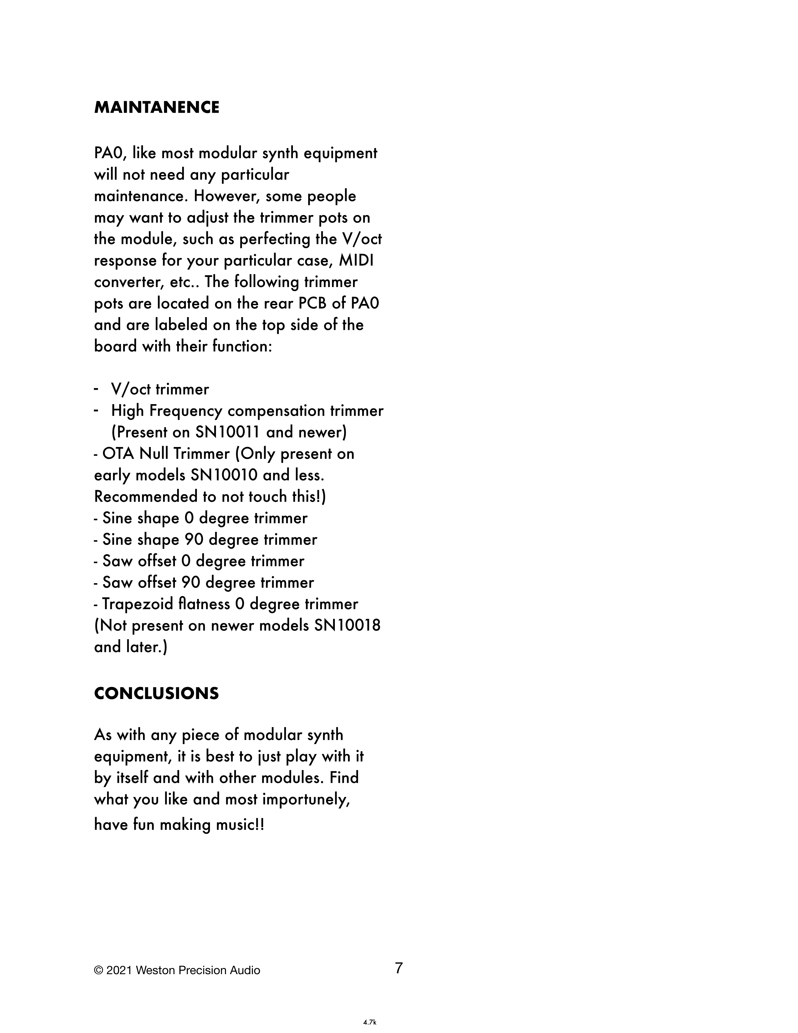 PA0は、ほとんどのモジュラーシンセ機器と同様に、特別なメンテナンスは必要ありません。ただし、モジュール上のトリマーポットを調整したい方もいるかもしれません。例えば、お使いのケース、MIDIコンバーターなどに合わせてV/octレスポンスを完璧に調整することができます。以下のトリマーポットはPA0のリアPCB上にあり、ボードの上面にその機能がラベル付けされています: