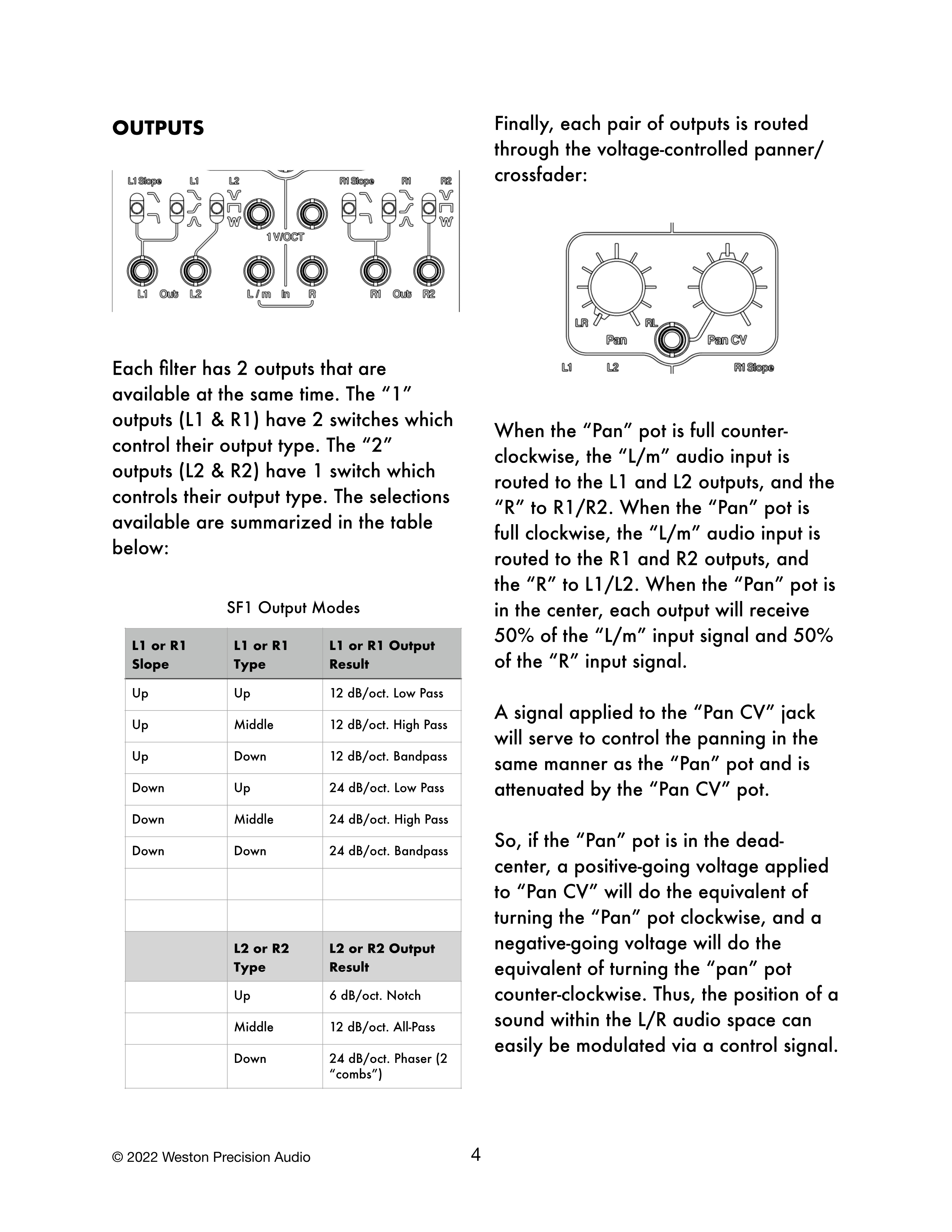 各フィルターには2つの出力があり、同時に使用できます。「1」出力(L1 & R1)には、出力タイプをコントロールする2つのスイッチがあります。「2」出力(L2 & R2)には、出力タイプをコントロールする1つのスイッチがあります。選択可能な設定は下記の表にまとめられています: