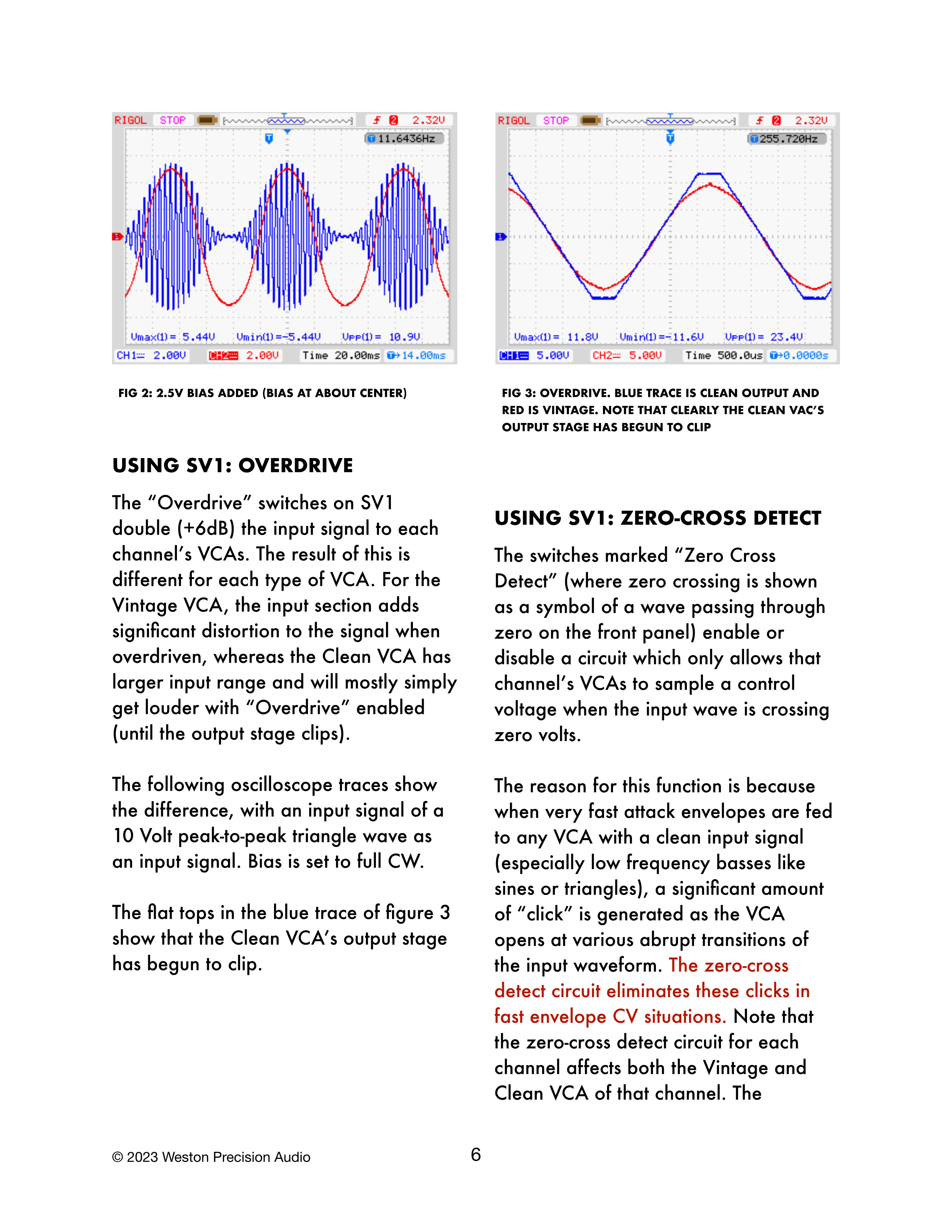 以下のオシロスコープの波形は、入力信号として10Vピークトゥピークの三角波を使用した場合の違いを示しています。Biasは最大CWに設定されています。図3の青色の波形の平らな頂点は、Clean VCAの出力段がクリップし始めたことを示しています。