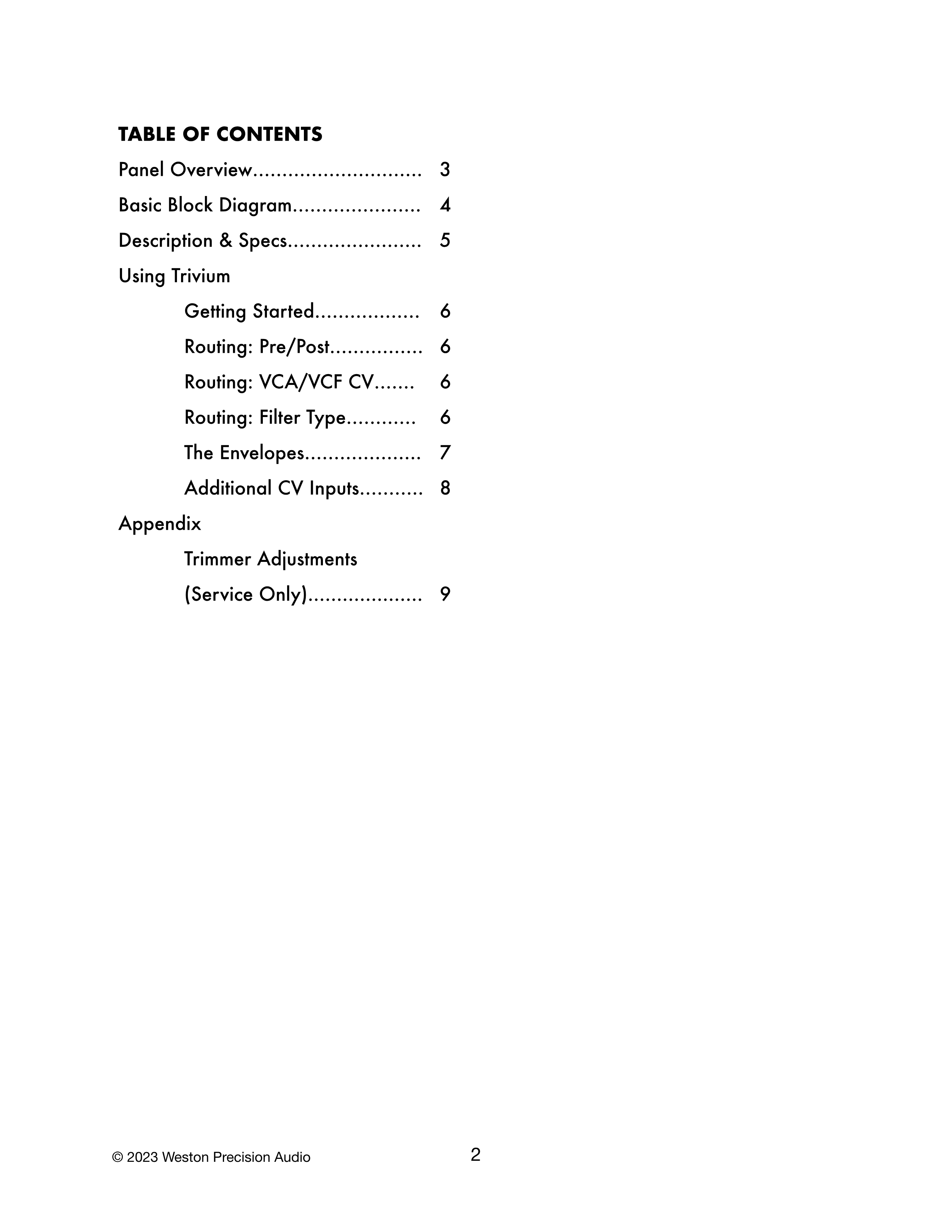 Triviumの使い方 使い始める……………… 6 ルーティング: Pre/Post……………. 6 ルーティング: VCA/VCF CV……. 6 ルーティング: フィルタータイプ………… 6 エンベロープ……………….. 7 追加のCV入力……….. 8