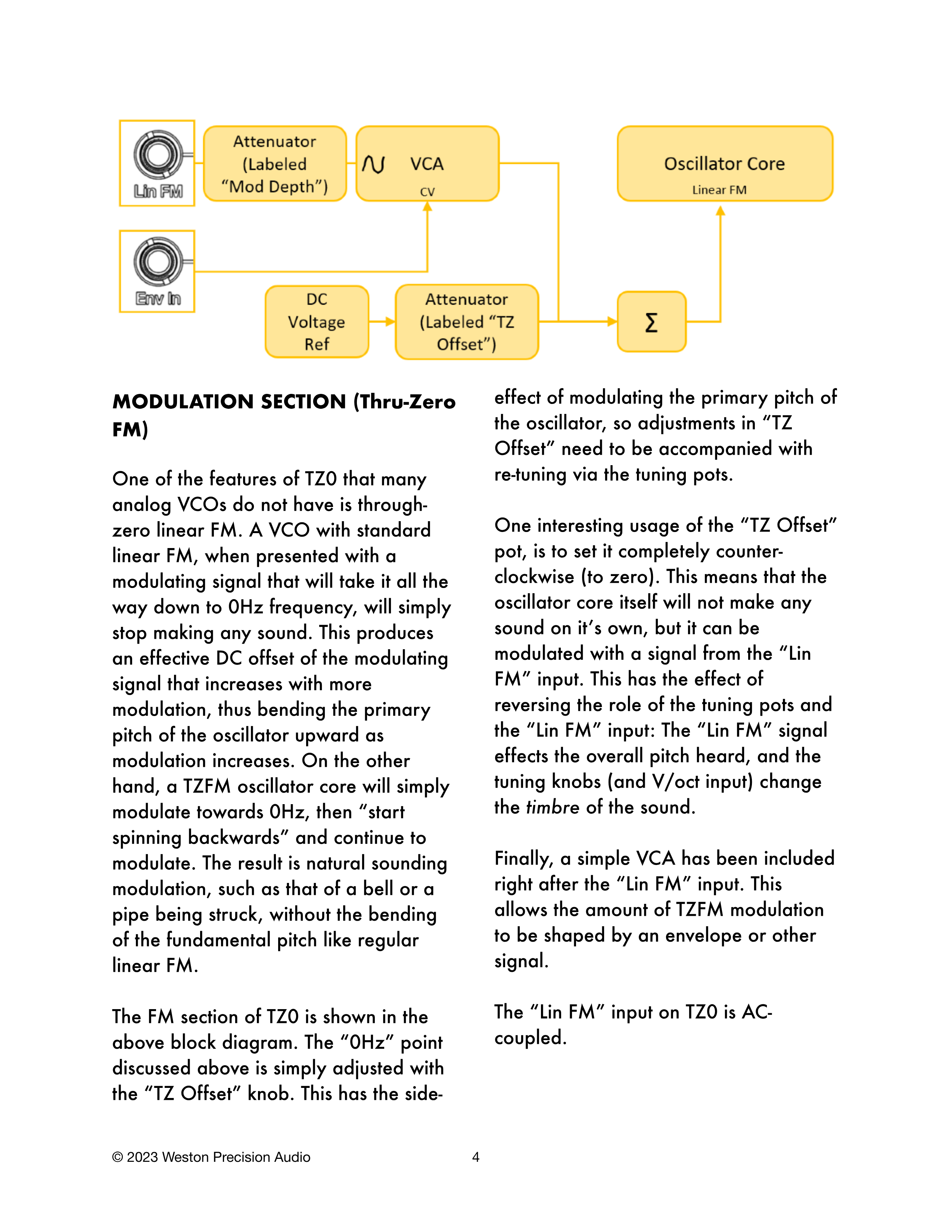 TZ0のFMセクションは上記のブロック図に示されています。上述の「0Hz」ポイントは、単純に「TZ Offset」ノブで調整されます。これはオシレーターの基本ピッチをモジュレートする副作用があるため、「TZ Offset」の調整にはチューニングポットによる再調整を伴う必要があります。