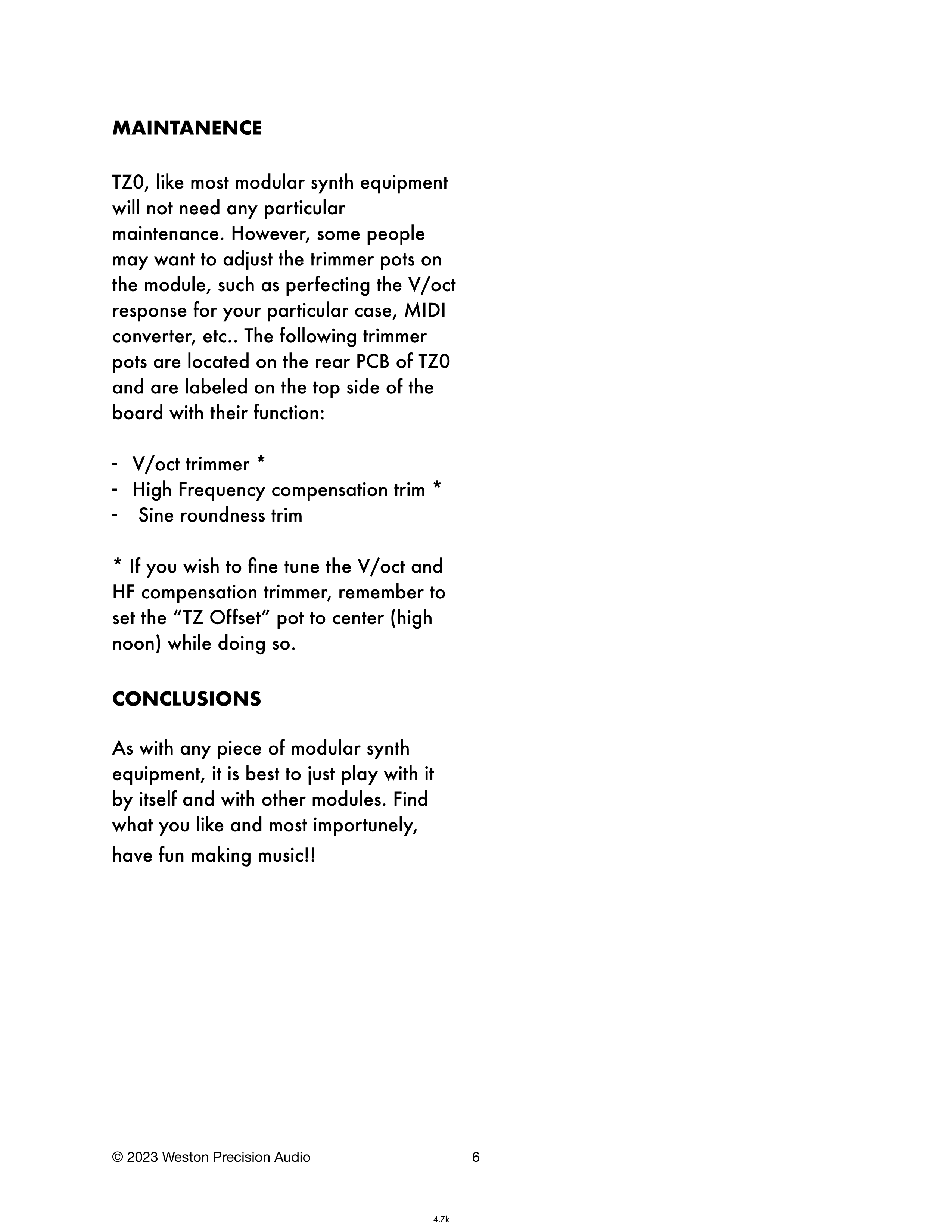 TZ0は、ほとんどのモジュラーシンセ機器と同様に、特別なメンテナンスは必要ありません。ただし、お使いのケース、MIDIコンバーター等に合わせてV/octレスポンスを完璧に調整するなど、モジュール上のトリマーポットを調整したい方もいるかもしれません。以下のトリマーポットはTZ0の背面PCB上に配置されており、基板の上面にその機能がラベル表示されています: