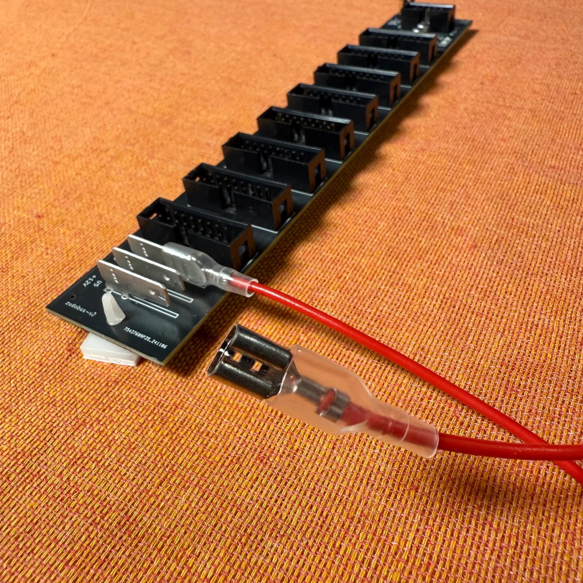 このセットアップでは、左側のzudo-busの右端のピンに電源用リボンケーブルを差し、そのケーブルの先を右側のzudo-busの入力に接続しています。これで右側のzudo-busは、左側のzudo-busからの電源と接続された状態になります。