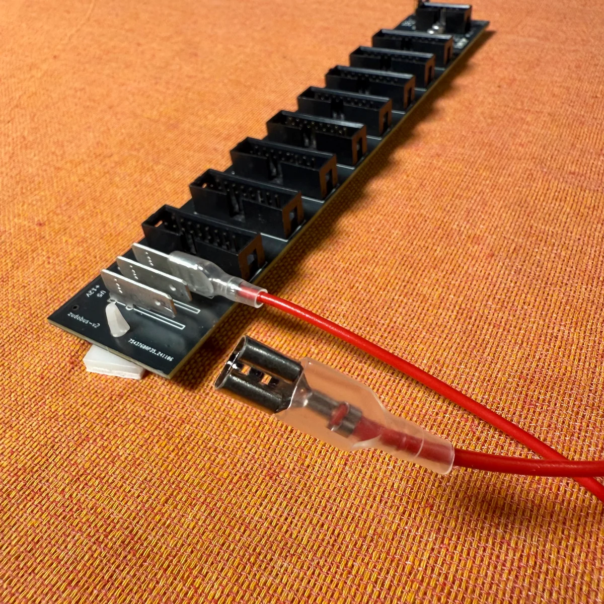 このため、たくさんのモジュールに給電する際にそれら電流を束ねる部分では、電源用リボンケーブルよりも太い銅線を利用した方がノイズの発生を抑制する効果が期待できます。ファストン端子を使えば太い銅線を選択することが可能です。